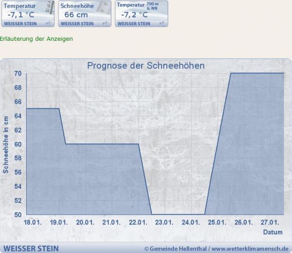 Unter dieser Abbildung sehen Sie die aktuellen Wintersportbedingungen am Weißen Stein. Zurzeit liegt am Mittelgebirge eine bei einer Tiefsttemperatur von 7,2° C auf 700 Metern Höhe, eine Schneedecke von 66 cm. Die aktuelle Prognose zeigt an, dass möglicherweise in den nächsten Tagen noch Schnee dazu kommt, bis auf eine Höhe 70 cm. Dies wären optimale Bedingungen für Wintersport also nichts wie los.