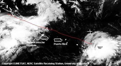 Der Sturm '03' zieht derzeit auf Puerto Rico und die Dominikanische Republik zu. Dabei betragen seine Windgeschwindigkeiten zur Zeit 30 Knoten (60km/h), und soll sich nicht mehr verstärken.