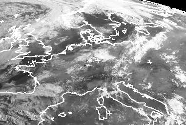 Über Deutschland liegen noch einige Wolken. Im Norden hat zunehmender Hochdruckeinfluss jedoch shon die meisten Wolken aufgelöst. Von Nordwesten nähert sich über der Nordsee ein neuer Tiefausläufer mit seinen Wolken, er wird jedoch morgen nur den äußersten Norden ein wenig streifen. In der Mitte und im Süden des Landes bilden sich unterdessen weitere Gewitter. (Bildquelle: NERC Satellite Receiving Station, Dundee University, Scotland, http://www.sat.dundee.ac.uk/)