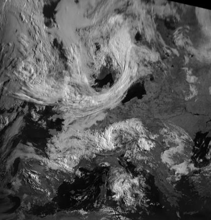 Über Bayern liegt das Zentrum des Tiefs 'Eliane', das vor allem in Süddeutschland, Tschechien und bis nach Ungarn für Wolken sorgt. Gut zu erkennen ist im Satellitenbild auch das Wolkenband der Kaltfront von Skandinavientief 'Friederike', das sich von Südschweden bis nach England erstreckt. Es zieht von Norden langsam nach Deutschland.