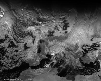 Auf dem heutigen Satellitenfoto zeigen sich dichte Wolken vom Norden der Iberischen Halbinsel, über die Biskaya, die Britischen Inseln bis nach Skandinavien, hierbei fällt verbreitet, zum Teil kräftiger Regen. Weiterhin halten sich über Norditalien bis nach Österreich vielfach dichte Wolken bei zeitweiligem Regen. Freundlicher und meist trocken ist es in weiten Teilen Mitteleuropas, im Südosten Europas und im Mittelmeerraum.