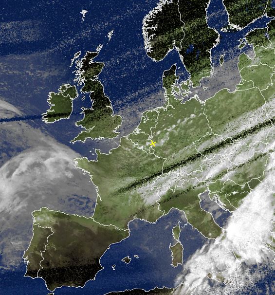 Auf dem Satellitenbild von heute Nachmittag erkennen wir die oft starke und dabei haufenartige Bewölkung quer über der Bundesrepublik, hier zog eine Kaltfront durch, in der sich zum Teil kräftige Schnee- oder Regenschauer bildeten, dabei wurde ein recht ausgeprägter Temperatursturz von meist 3 bis 5 Grad C verzeichnet.