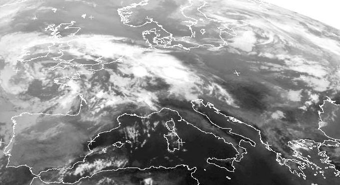 Auf dem Satellitenbild von Mittwoch früh erstreckt sich ein breites Wolkenband von Großbritannien über die Beneluxstaaten bis zu den Alpen. Es gehört zu einem Tief mit Zentrum am westlichen Ausgang des Ärmelkanals. In diesem Tiefausläufer bilden sich heute verbreitet Schauer und Gewitter. Von Skandinavien bis nach Russland sorgt ein weiteres Tief für viele Wolken und zeitweiligen Regen. Sonst ist der Himmel unter Hochdruckeinfluss meist nur leicht bewölkt.