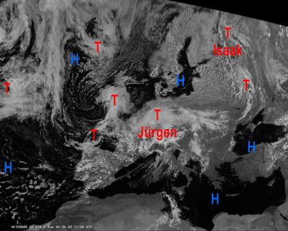 Auf dem Satellitenfoto von heute Nachmittag zeigen sich mehrer Tiefausläufer über der Mitte und dem westlichen Europa, die hier für zahlreiche Schauer und teils auch für Gewitter sorgen. Auch im Norden und Nordosten Europas ist es bei vielfach schwachem Tiefdruckeinfluss meist stark bewölkt und es kommt zu einzelnen Schauern. Deutlich freundlicher und weitgehend trocken ist es rund ums Mittelmeer und von dort weiter bis zum Schwarzen Meer.