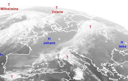 Das Hoch 'Johann' über Mitteleuropa bescherrt heute weiten Teilen dieser Region freundliches und trockenes Wetter. Einzelne Niederschläge beschränken sich zumeist auf die Alpenländer. Ebenso freundlich ist es dank Hoch 'Imko' in einem Großteil Osteuropas, hier stört allerdings teilweise zäher Nebel das sonst freundliche Herbstwetter. Tiefausläufer im Norden und Nordwesten Europas sorgen vor Allem in Irland, Schottland und Norwegen für teils kräftige Schauer.