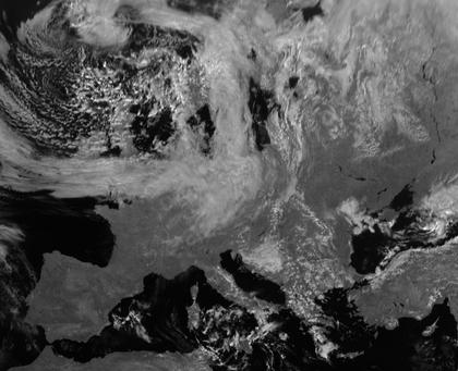 Während im Nordwesten Europas die Tiefs 'Hiltrud' und 'Imogen' für dichte Wolken sorgen, ist es im Süden Europas unter Einfluss von Hoch 'Julius' nur wenig bewölkt.