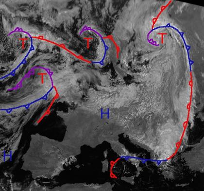 Auf dem heutigen Satellitenbild finden sich einige Tiefdruckgebiete mit dichten Wolken über dem Nordwesten Europas. Auch über Finnland liegt ein Tiefdruckgebiet, dessen Ausläufer und Wolken sich bis nach Griechenland und Italien erstrecken und dabei für teils kräftige Schauer und Gewitter sorgen. Über Süddeutschland hat sich Hoch 'Ottilia' aufgebaut, das in einer Hochdruckbrücke mit einem Azorenhoch verbunden ist. In diesem Bereich ist es meist wolkenarm.