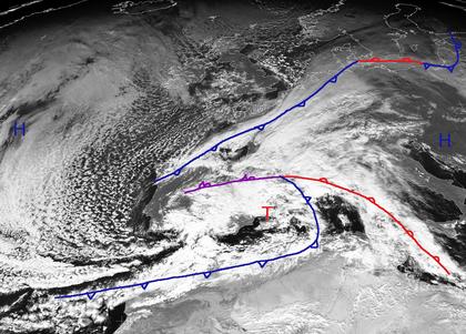 Viele dichte Wolken kennzeichnen heute das Satellitenbild über Europa. Ursache hierfür ist zum einen das Tief 'Sabrina' mit Zentrum über Skandinavien und zum anderen das Tief 'Tine' mit Zentrum über Spanien. Weiter nach Nordwesten zeigen sich einige Schauergebiete, eines davon verläuft westlich an Spanien vorbei auf den afrikanischen Kontinent zu. Die Tiefdruckgebiete verlagern sich nun weiter nach Südosten und machen in Mitteleuropa den Weg frei für kalte Luft aus dem Norden. (Bildquelle: Copyrigt EUMETSAT, NERC Satellite Receiving Station, University of Dundee)