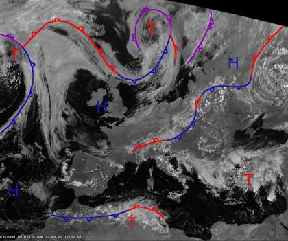 Hoch 'Petra' über den Britischen Inseln ragt mit ihren Wolkenlücken deutlich zwischen den sie umgebenen Tiefdruckgebieten hervor. Dabei liegt ein Tiefdrucksystem mit einigen Wolken von den Alpen bis nach Russland. Auch über Nordeuropa herrscht vielfach starke Bewölkung. Des weiteren befinden sich über dem nördlichen Afrika und vor allem über Südosteuropa Tiefdruckgebiete, die für teils kräftige Schauer und Gewitter sorgen. Vor allem die Türkei ist wie in den letzten Tagen davon betroffen.
