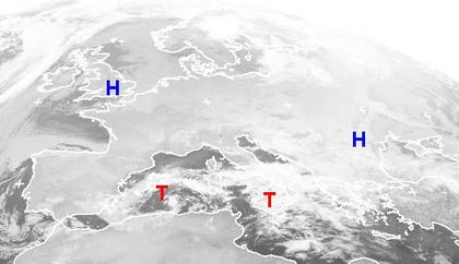 Hochdruckeinfluss sorgt in weiten Teilen Europas für teils freundliches, teils aber auch trübes Wetter. Vor allen über Deutschland liegt eine dichte Hochnebeldecke. Im Mittelmeer bringen dagegen zwei Tiefdruckgebiete örtlich Schauer oder Gewitter. (Bildquelle: NERC Satellite Receiving Station, Dundee University, Scotland, http://www.sat.dundee.ac.uk/)