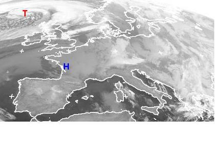 Vor allem über der Iberischen Halbinsel und Frankreich sorgt das Hoch 'Quentin' für ruhiges und trockenes, teils aber auch trübes Wetter. Dagegen bringen weiter im Osten schwache Tiefausläufer noch teils dichte Wolken mit etwas Regen oder Schnee. Auch zieht über dem Atlantik schon das nächste Tiefdruckgebiet heran. (Bildquelle: NERC Satellite Receiving Station, Dundee University, Scotland, http://www.sat.dundee.ac.uk/)