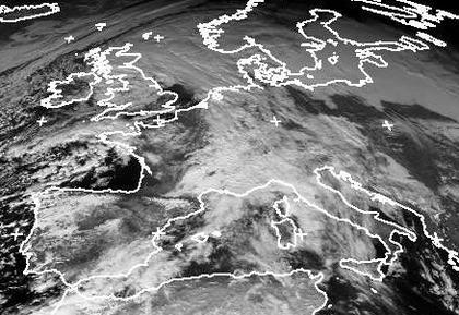 In der Höhe liegt über weiten Teilen Europas warme Luft, sie erreicht jedoch nicht die tieferen Höhenlagen. Hier hält sich teils Hochnebel, wie im Satellitenbild vom Mittwochmittag vor allem über der Ostsee und dem Baltikum zu sehen. Weiter südlich konnte der Hochdruckeinfluss und die trockene Luft die Wolken teils auflockern. Dichtere und höher reichende Wolken erstrecken sich von der Nordsee bis nach Italien. Hier liegt der Frontbereich zu etwas kühlerer Luft über Westeuropa. (Bildquelle: NERC Satellite Receiving Station, Dundee University, Scotland, http://www.sat.dundee.ac.uk/)