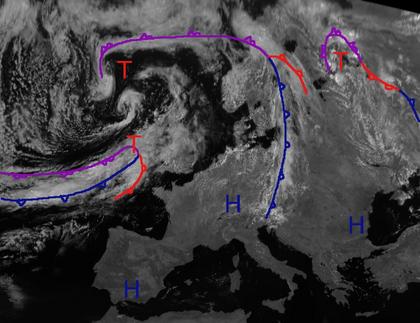Hochdruckeinfluss bestimmt heute das Wetter vor allem über Südeuropa. Hier ist es häufig wolkenlos. Dagegen bringt Tief 'Yves' bei Island dichte Wolken mir Regen, Schauern und Gewittern von Island bis Skandinavien und weiter nach Süden bis zu Ostalpen. Ein weiteres Tief sorgt für Schauer und Gewitter über Russland. Über dem Atlantik zieht ein neues Tief Richtung Britische Insel. In der Nacht zum Mittwoch erreichen dessen Ausläufer mit Schauern und Gewittern auch Deutschland.