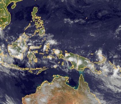 Auf dem Satellitenbild ist über Indonesien die konvektive Bewölkung der innertropischen Konvergenzzone erkennbar.