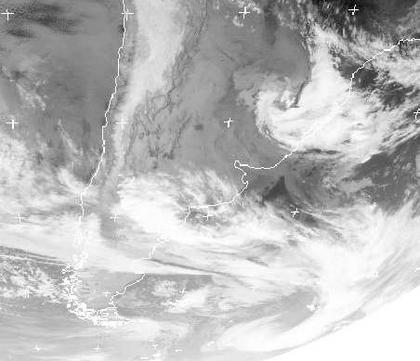 Ein Frontensystem erstreckt sich mit seinen Wolken von West nach Ost über den Süden Südamerikas. Es trennt kalte Luft im Süden von wärmerer im Norden. Dabei kommt es teils auch zu Schneefall. Ein weiterer Tiefdruckwirbel ist weiter nordostwärts, über dem Süden Brasiliens zu erkennen.