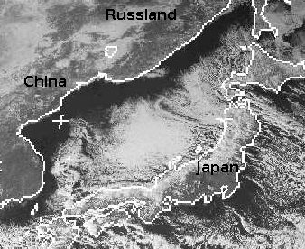 Aus Russland gelangt derzeit Kaltluft nach Japan. Über dem Japanischen Meer entwickeln sich dabei Schneeschauer, die dann nach Japan ziehen.