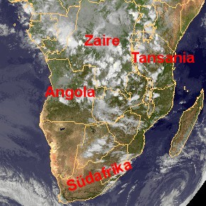 Auf dem heutigen Satellitenbild vom südlichen Afrika sind besonders über dem Osten Angolas, über Zaire und über Tansania vielfach hochreichende Quellbewölkung zu erkennen. Diese sorgt besonders in Zentral-Zaire für kräftige und ergiebige Niederschläge, häufig auch in Verbindung starker Gewitter. in den südlichsten Ländern Afrikas ist es dagegen weitgehend heiter und meist auch sonnig und dabei trocken.