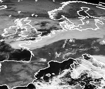 Von Frankreich bis nach Polen erstreckt sich auf dem Satellitenbild vom Donnerstagmittag eine markante Hochnebelgrenze. Auf der Nordseite eines Hochs über Frankreich ist feuchte Luft bis weit nach Osten geströmt. Unter dem Hochdruckeinfluss hat sich in ihr eine dichte Hochnebeldecke gebildet. Weiter nach Süden konnte die feuchte Luft wegen des Hochs jedoch nicht strömen. Dort findet man teils wolkenfreie Gebiete. Es gibt jedoch wenige, begrenzte Ausnahmen, dazu gehört am Donnerstag das Oberrheintal. (Bildquelle: NERC Satellite Receiving Station, Dundee University, Scotland, http://www.sat.dundee.ac.uk/)
