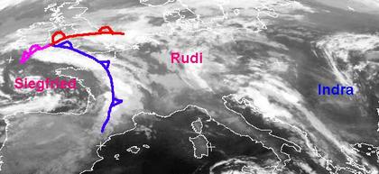 Ein Tiefdrucksystem bringt wechselhaftes Wetter in West- und Mitteleuropa. Über der Biscaya ist das Tief 'Siegfried' zu erkennen, das kleine Tief 'Rudi' liegt genau über Deutschland. In Osteuropa sorgt das Hoch 'Indra' sichtbar für freundliches Wetter.