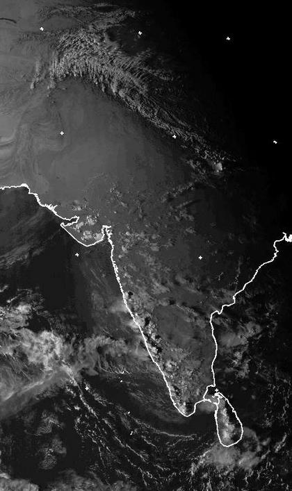 Das Satellitenbild von Mittwoch Mittwoch zeigt über Indien nur noch wenige Schauer- und Gewitterzellen, im Nordwesten Indiens ist es teilweise wolkenlos. Die von Juni bis Oktober dauernde Regenzeit des indischen Monsuns ist jetzt fast vorbei. Von Osten bricht auf dem Foto bereits die Nacht herein (Satellitenfoto im sichtbaren Bereich von 14 Uhr MESZ), die Höhenzüge des schnee- und eisbedeckten Himalayas sind aber noch deutlich auszumachen. (Bildquelle: NERC Satellite Receiving Station, Dundee University, Scotland, http://www.sat.dundee.ac.uk/)