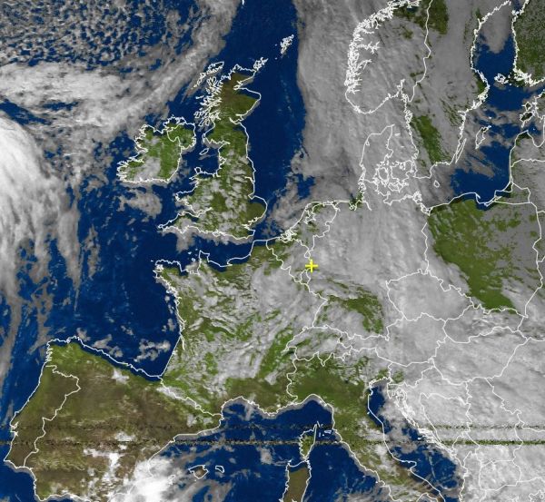 Auf dem Satellitenfoto von heute Nachmittag zeigt sich ein breites und dichtes Wolkenband, das sich vom südlichen Skandinavien, über die Nordsee, große Teile Deutschlands, Tschechien, die Ostalpen, Ungarn und über weite Teile Südosteuropas erstreckt. Unter den dichten Wolken fällt zudem verbreitet, zum Teil langanhaltender Regen.