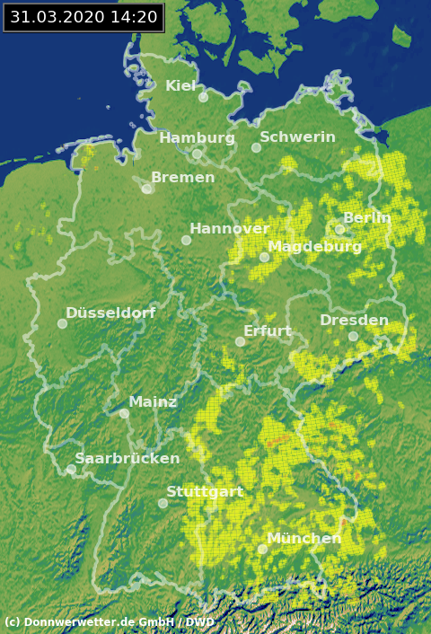 Das Radarbild von 14.20 Uhr zeigt in der Osthälfte örtlich leichtere Schauersignale mit Schnee, Schneeregen oder Graupel die von Nord nach Süd wandern. Zum Abend hin werden die Schauerwolken aber weitgehend in sich zusammenfallen und der Himmel aufklaren. Dann rutschen die Temperaturen verbreitet wieder in den frostigen Bereich.