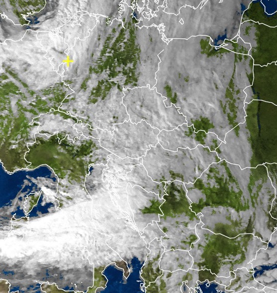 Im heutigen Satellitenbild sind die Wolken von Tief "Danielle" gut über Belgien und den Niederlanden zu sehen. Sie ziehen von Westen her auf und bringen am Abend Regen im Westen. Über Ostdeutschland sind noch Reste von Wolken vom alten sich auflösenden Tief zu sehen, auch über der Adria sind noch Wolken des alten Tiefs.