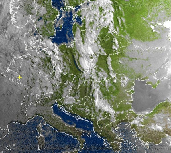Auch östlich davon kommt es zu teils kräftigen Schauern und Gewittern. In einem breiten Streifen vom Süden Finnlands bis in den Norden Griechenlands treffen die kühleren Luftmassen aus dem Norden auf heiße Luft im Osten. Entlang dieser Luftmassengrenze bilden sich im Tagesverlauf überall hochreichende Quellwolken und in der Folge auch mitunter schwere Gewitter.