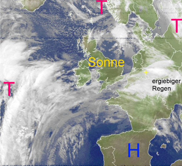 Auf dem heutigen Satellitenbild erkennt man gut die Wolkenzone, die vom Atlantik bis nach Mitteleuropa verläuft und vor allem in Teilen Süddeutschlands für ergiebigen Regen sorgt. Im Schwarzwald sind bisher teilweise schon über 50 Liter / m² gefallen. Hier wird der Dauerregen jetzt aber bald nachlassen. An den Alpen regnet es jedoch noch bis Freitag weiter. Hier können noch ca 50 Liter / m² hinzukommen. In Verbindung mit der Schneeschmelze in den Bergen sind kleinräumigere Überschwemmungen möglich.
