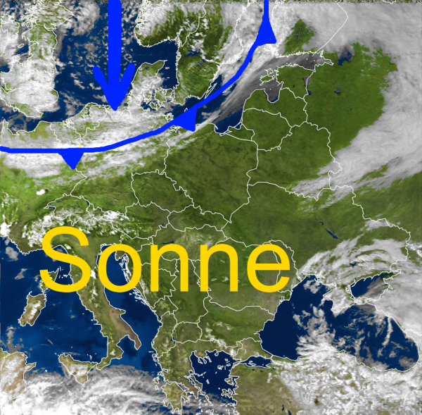 Auf dem heutigen Satellitenbild erkennt man die über Deutschland liegende Kaltfront, die unser Land in eine wolkenverhangene Nordwesthälfte und freundliche Südosthälfte teilt. Hinter der Front strömt deutliche kühlere Luft aus polaren Breiten nach Mitteleuropa. Allerdings haben die Wolken der Front kaum Regen im Gepäck. Die andauernde Trockenheit geht also in den meisten Gebieten zunächst weiter.