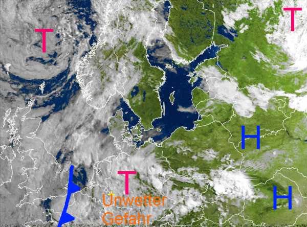 Das Tief über Deutschland löst regional teils kräftige gewittrige Regengüsse aus. In der schwül-warmen Luft drohen örtlich wieder Unwetter mit Starkregen, Hagel und auch Sturmböen. Dabei kann es auch zu kleinräumigen Überschwemmungen kommen. Hierbei gilt allerdings auch die berühmte Regel, es wird bei weitem nicht alle treffen, aber einige müssen damit rechnen. Größere Gebiete bleiben auch von Gewitterschauern verschont.