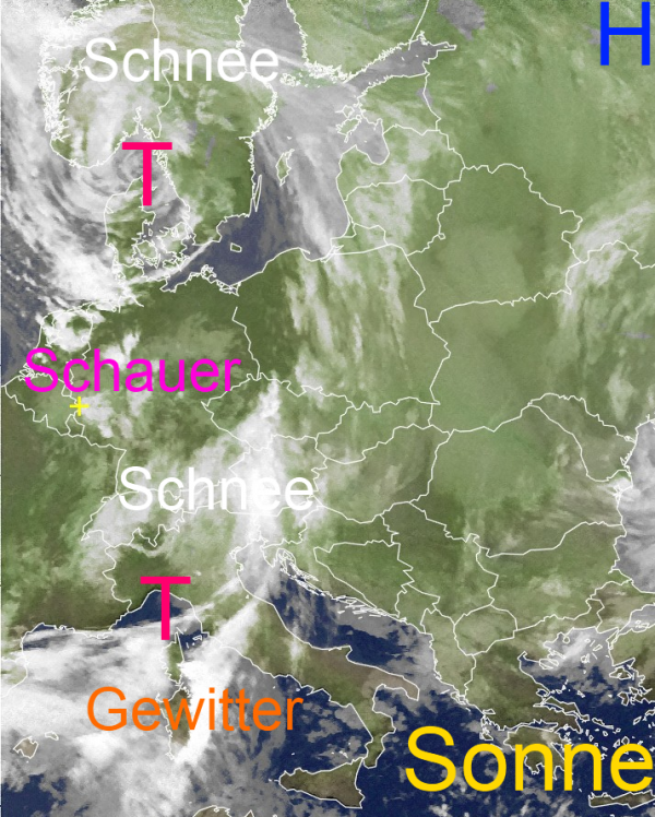 Ein kleines Sturmtief über dem Skagerrak sorgt in Deutschland zu Rosenmontag für klassisches Aprilwetter. Dabei treten regional teils kräftige Schnee-, Schneeregen- und Graupelschauer auf, vereinzelt auch mit Blitz und Donner. Stellenweise muss mit erheblicher Glätte gerechnet werden.
