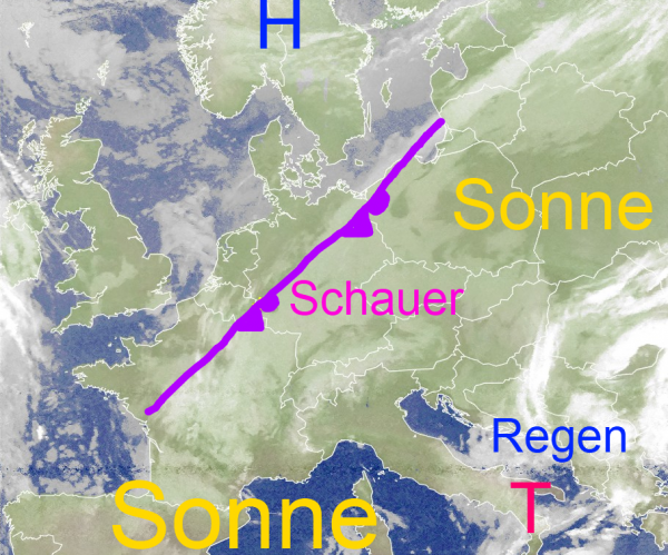 Hinter dem Wolkenband, welches eine Mischfront charakterisiert strömt etwas kühlere Nordseeluft ins Land. Durch die mit etwas Sonneneinstrahlung entstehende Labilität, haben sich am Nachmittag örtliche Schauer entwickelt.