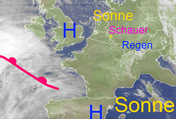 Morgen nimmt dann im Tagesverlauf die Warmfront über dem östlichen Atlantik Kurs auf den Westen unseres Landes und sorgt anschließend wieder für leichten Regen.