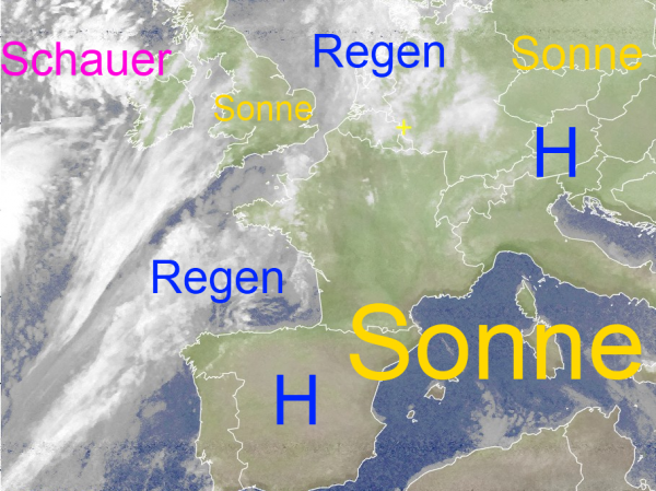 Sonst erkennt man jedoch größere Wolkenfelder und Bänder, die den Nordwesten unseres Landes mit ihren Regenwolken schon erreicht haben.