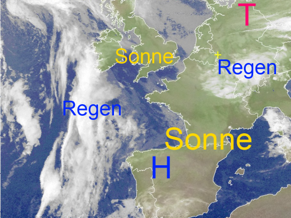 Dazwischen gibt es zwischen den Britischen Inseln und Südwesteuropa eine freundlichere Zone mit Sonnenschein.