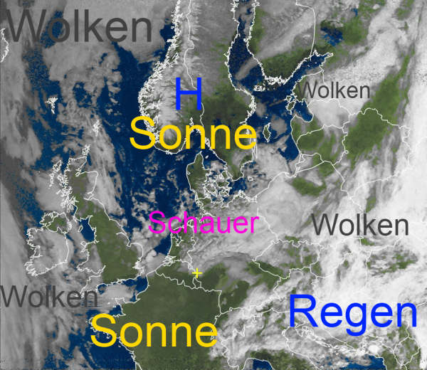 Rund um das Hoch im Norden gibt es aber auch reichlich Sonnenschein. Die helleren Felder über Skandinavien deuten auf die noch verbreiteten Schneeflächen hin.