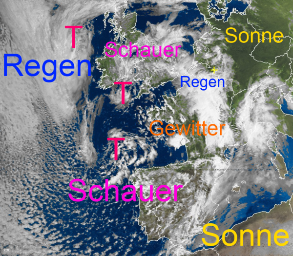 Die Kaltfront des Tiefs bei Irland, zu erkennen an dem hellen Wolkenband erreicht gegen Abend den Südwesten und Westen mit Regengüssen und örtlichen Gewittern. Morgen werden auch die südlichen und östlichen Landesteilen mit Regen und Schauern versorgt. Dabei können vor allem im Süden mehr als 20 Liter Niederschlag auf den Quadratmeter fallen. Für die ausgetrockneten Gebiete im Norden und Osten dürfte der zu erwartende Regen jedoch nur der berühmte Tropfen auf den heißen Stein sein.