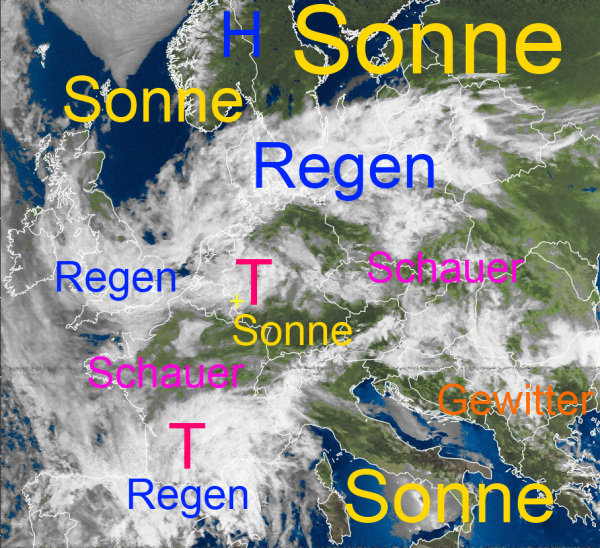 Das Tief über Südwestfrankreich zapft in seinem Vorfeld wärmere Luft aus Osteuropa an. Es breitet sich morgen nach Mitteleuropa aus. In der zunehmend labilen Luftmasse brauen sich mit sonniger Einstrahlung teis mächtige Schauer- und Gewitterwolken zusammen, die sich in Form von Platzregen und Hagel entladen können. Wegen der windschwachen Wetterlage am Wochenende können sich die Wolken auch längere Zeit über bestimmten Gebieten aufhalten, so dass es eng begrenzt zu enormen Niederschlagsmengen kommen kann. In Folgedessen besteht die Gefahr von kleinräumigen Überschwemmungen.