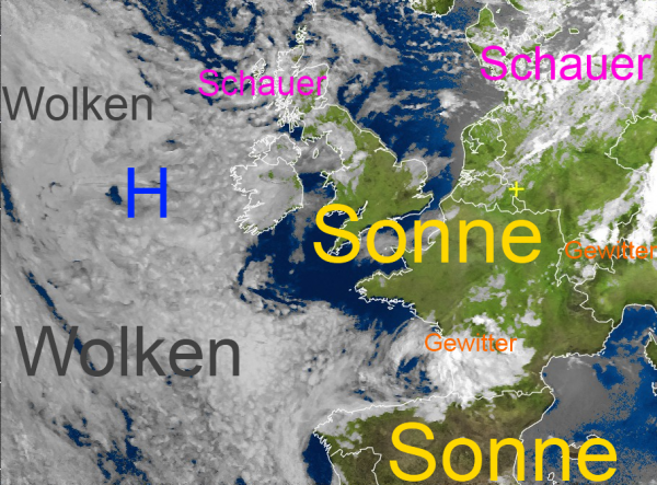 In der einströmenden frischeren Nordmeerluft haben sich im Norden unseres Landes einige Schauerwolken gebildet. Über den Alpen und Teilen Südfrankreichs entladen sich örtliche Gewitter. Sonst gibt es über großen Gebieten Mitteleuropas wolkenfreie Zonen mit reichlich Sonnenschein.