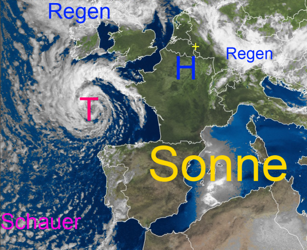 Über dem östlichen Atlantik hat sich ein klassischer Wolkenwirbel gebildet. Er gehört zu einem kleinen Sturmtief, das mit seinen Regen- und Schauerwolken bis Donnerstag unter Abschwächung über die Britischen Inseln zur Nordsee wandert. Gleichzeitig zapft dieses Tief auch kühlere Polarluft an, welche nach Wochenmitte die Temperaturen in unserem Land auf normalen Sommerniveau hält. Zeit und gebietsweise muss auch in Deutschland mit Regengüssen und Gewittern gerechnet werden.