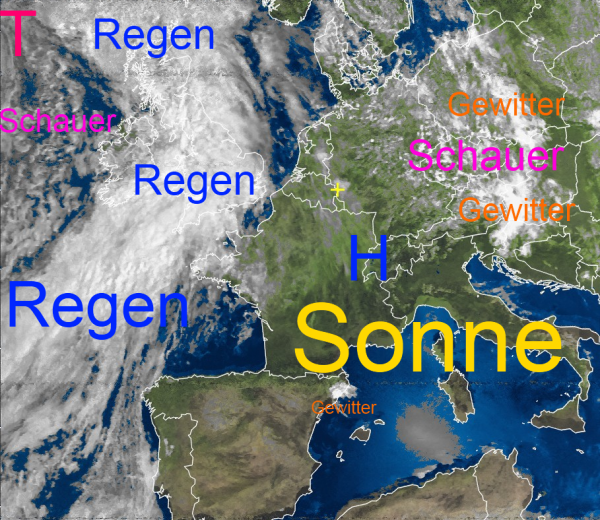 Die breite Wolkenzone des Tiefs über dem Atlantik bringt heute bereits schon den Britischen Inseln einen unbeständigen und trüben Tag. Sie zieht langsam nach Osten und erfasst unser Land am Wochenende mit Regenfällen, Schauern und örtlichen Gewittern.
