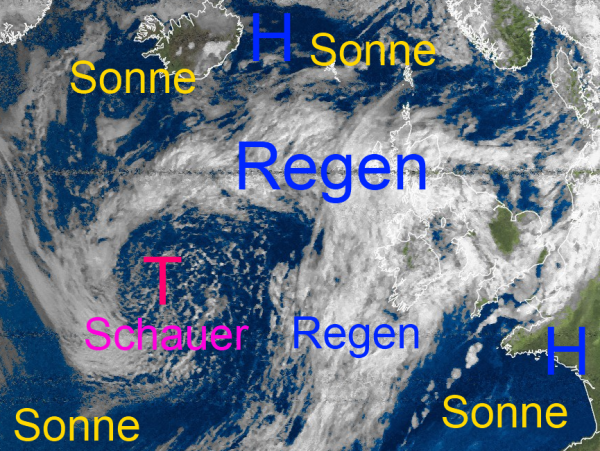 Draußen über dem Atlantik hat sich ein beeindruckender Wolkenwirbel gebildet. Das dazugehörige Tief wandert bis Mittwochabend mit seinen Regen- und Schauerwolken über die Britischen Inseln hinweg Richtung Norwegen. Hinter dessen Kaltfront, die uns von Mittwoch auf Donnerstag mit Regengüssen überquert strömt kühle Polarluft nach Mitteleuropa, die sozusagen den Frühherbst einläutet.