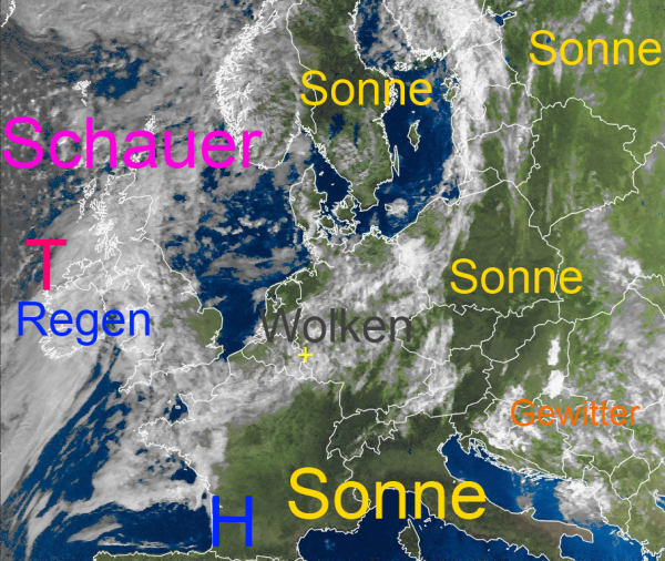 Sonst gibt es über dem Kontinent aber auch größere wolkenfreie Zonen mit reichlich Sonnenschein.