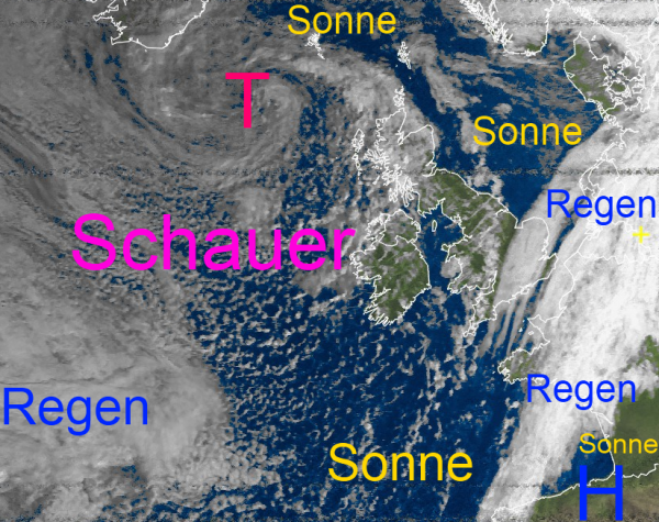 Steuerfaktor ist ein umfangreiches Tiefdruckgebiet im Seegebiet zwischen Island und Schottland zu erkennen an der spiralförmigen Wolkenstruktur. Das dazugehörige kompakte Wolkengebiet überquert uns heute mit seinen Regenwolken.