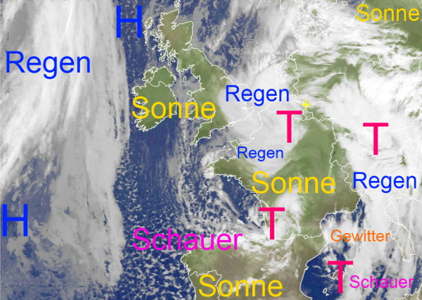 Mehrere kleinere Tiefdruckzellen bilden einen Tiefdruckkomplex und lösen gebietsweise Regenfälle, Schauer und auch einige Gewitter aus. Vor allem über Norditalien und Teilen des Mittelmeeres schüttet es dabei wie aus Eimern.
