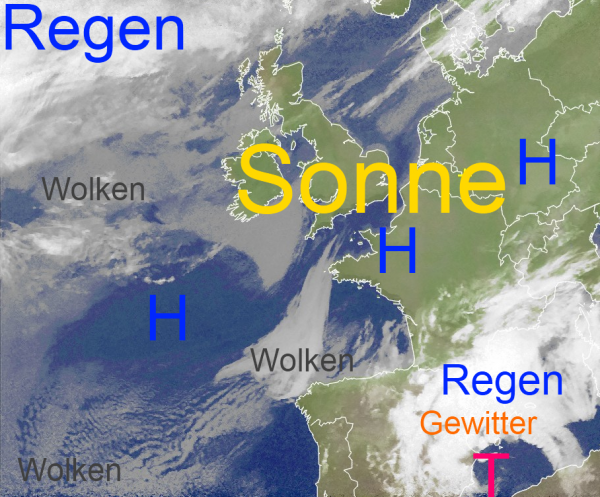 Über dem westlichen Mittelmeer und Teilen Spaniens erkennt man die Wolkenspirale eines Tiefs, welche hier zum Teil für kräftige Regenfälle und Gewitter sorgt. Auf den Bergen kann es schneien.
