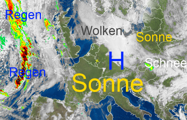 Auf dem heutigen Satellitenbild erkennt man trotz des mitteleuropäischen Hochdruckgebietes die Zone der tiefhängenden, zähen Bewölkung, die Deutschland in eine trübe Nordosthälfte teilen. Örtlich nieselt es daraus auch etwas. Sonst strahlt abgesehen einzelner Nebel- oder Hochnebelfelder in Flussniederungen verbreitet die Sonne von einem heiteren Himmel.