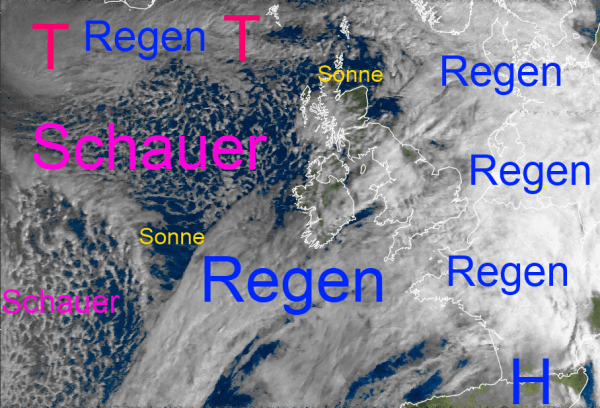Auf dem Atlantik befindet sich nach wie vor genügend Wolkennachschub, welcher nach Mitteleuropa steuert und für reichlich Regen sorgt. Lediglich zwischen den wabenförmigen Schauerwolken erkennt man kleinere Aufheiterungen.