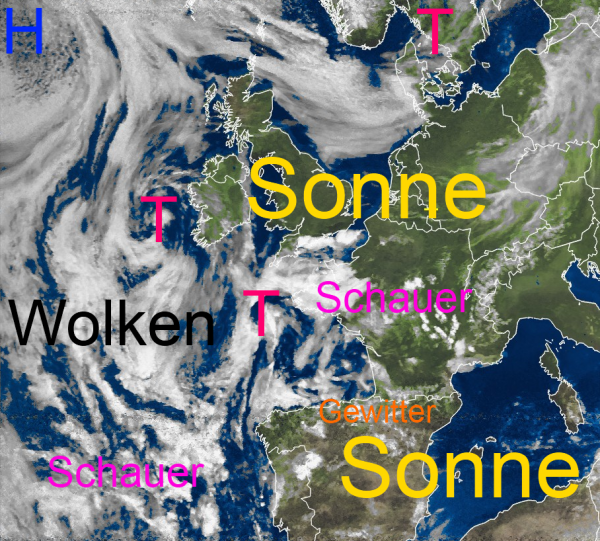 Über dem Atlantik herrschen derzeit wegen meist nur schwachen Luftdruckgegensätze unterschiedliche Strömungen mit verschiedenen Wolkenstrukturen. Regen fällt aus den Wolken auch hier aber eher nur selten und nicht sonderlich ergiebig.